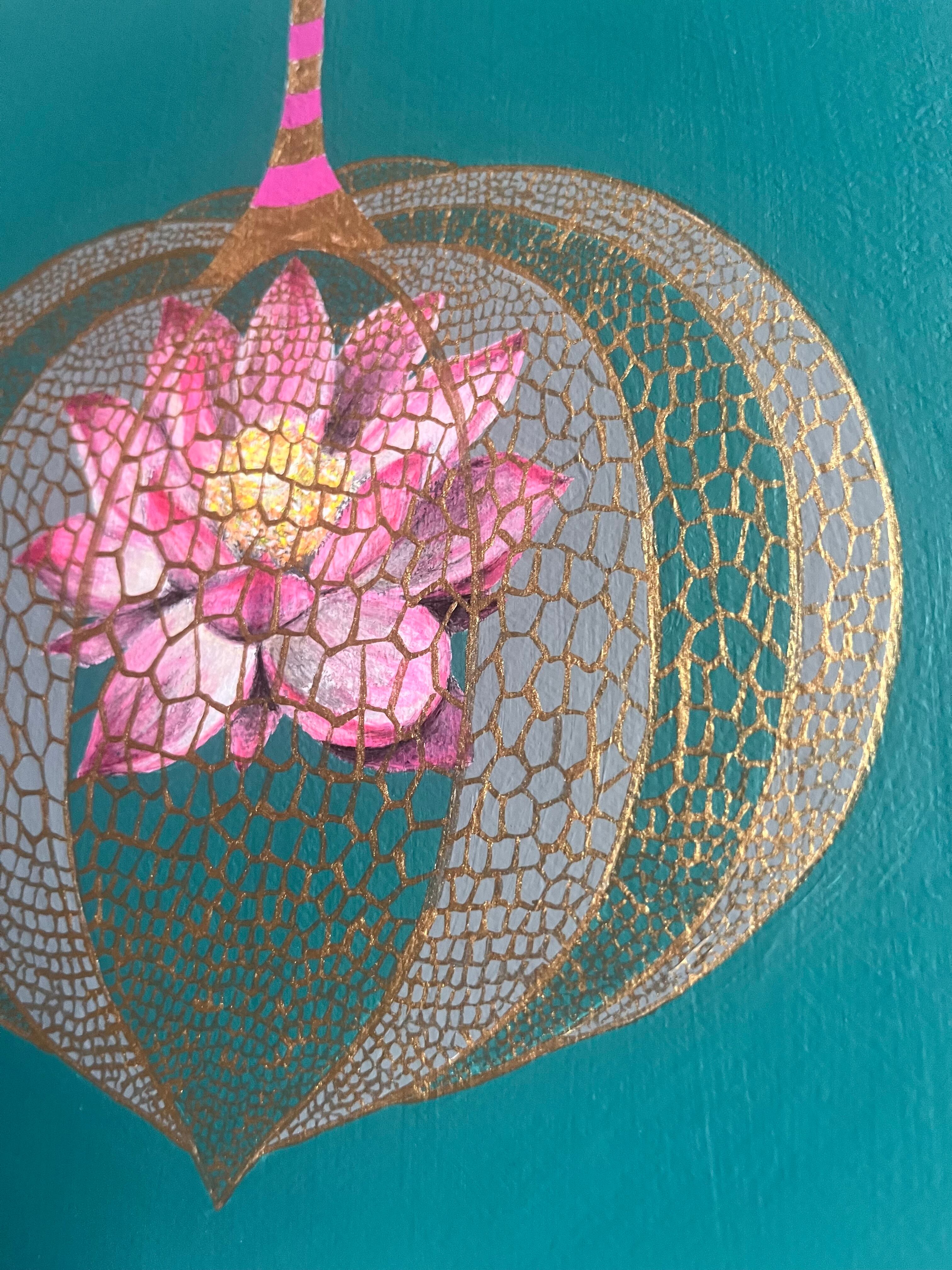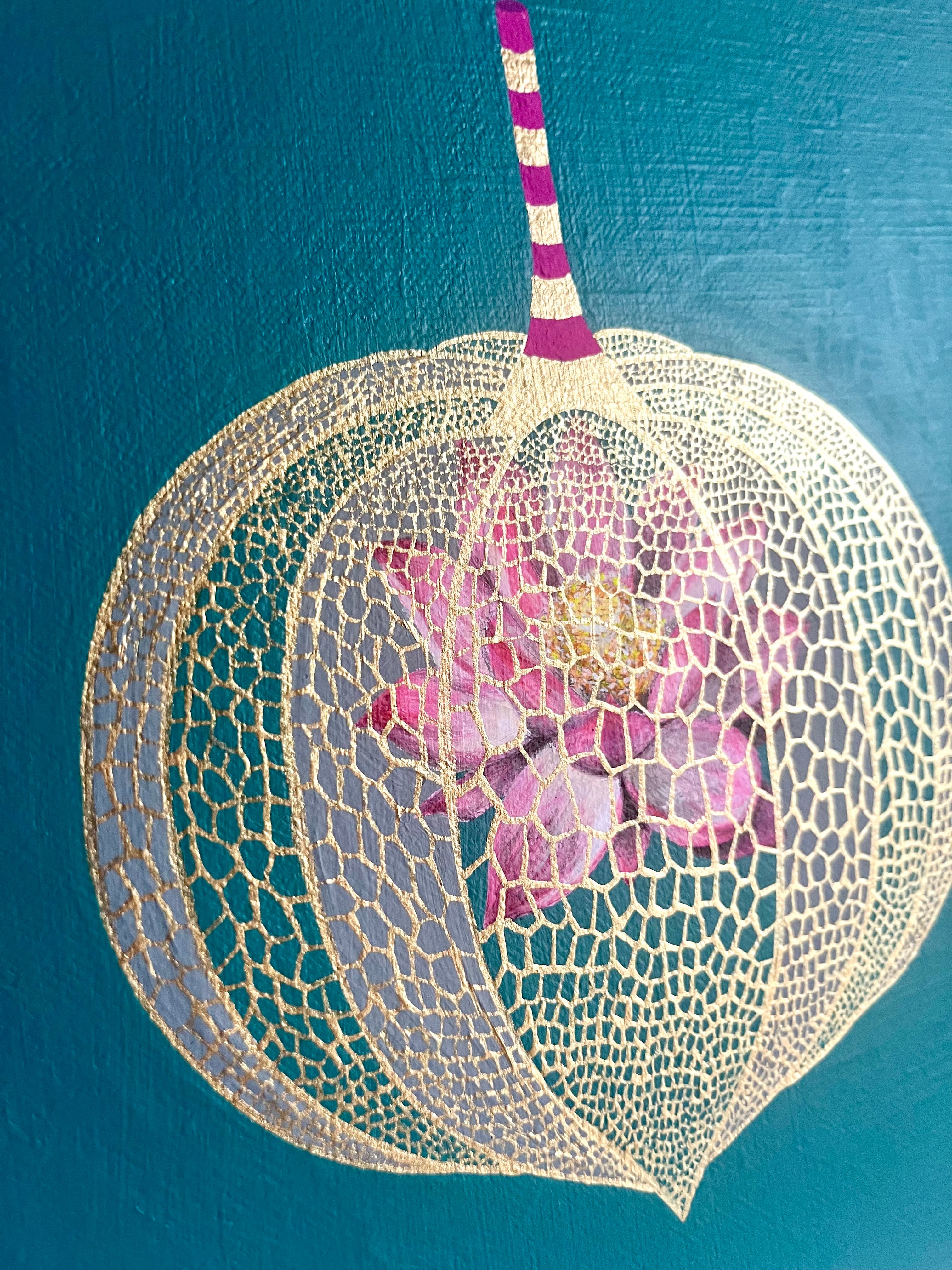 それなのに何故、ホオズキをモチーフに選んだのかというと僕はホオズキを嘘や偽りだと思っていないからです。むしろその逆で、真実を表していると思っています。ホオズキの実は、枯れると葉脈だけが残り中の丸い実が丸見えになります。これこそ、隠し事のない、真実を表している姿ではないでしょうか。現代社会は混沌さを極め、何が真実で何が嘘なのかもわからない時代になってしまいました。こんな時代だからこそ自分の心に正直に生きる大切さをホオズキを通して表現しています。