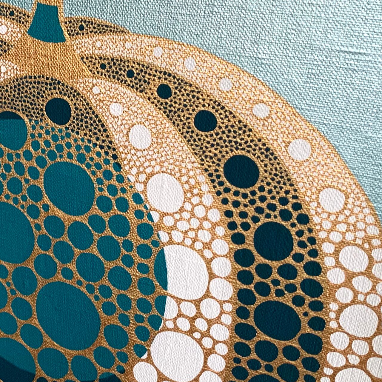 青色は仕事運をアップしてくれます。ビジネスで成功したい人や起業で成功したい人にオススメです。葉脈部分はゴールドの反射絵の具で描いているので、複製画では表現できない光沢があります。光の当たり方によって見え方が全く異なるので、朝昼晩と違う顔を見せてくれます。原画ならではの質感を楽しんでもらえたらと思います。